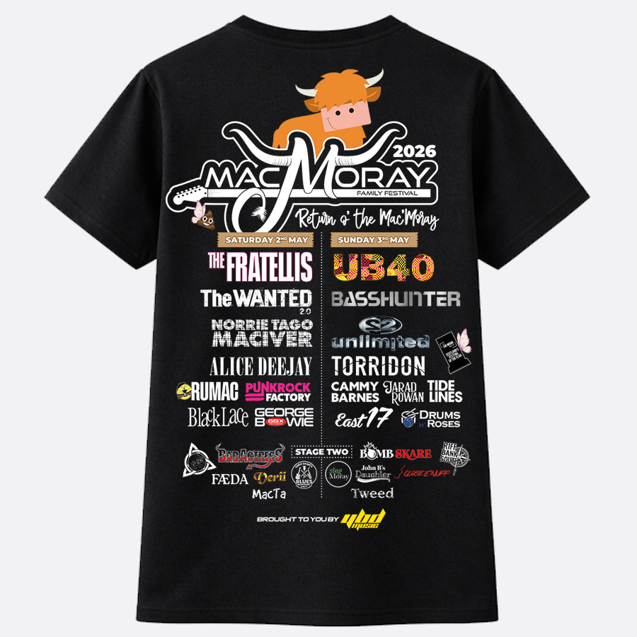 New for MacMoray Festival 2026, we have some brilliant new merchandise available to purchase from the website- and one you’ve all been waiting for, an official lineup tshirt/hoodie!