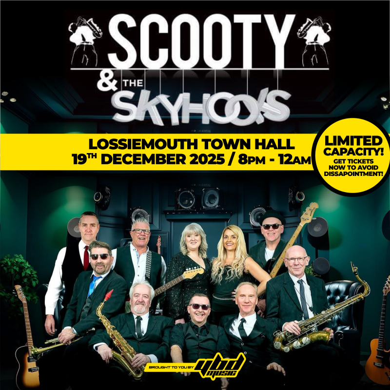 As part of their 2025Â Tour, Scooty & The Skyhooks are heading your way! Formed in the Highlands in 1984 playing an energetic set of Soul & Motown classics that fill dancefloors, last year marked their 40th Anniversary, which led to a sell-out tour in 2024. Fresh off the back of that, the tour continues into 2025!- Lossiemouth Town Hall