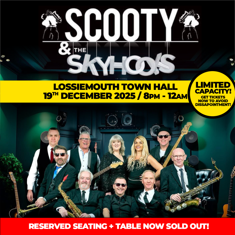 Reserved Table & Seating Now SOLD OUT! As part of their 2025Â Tour, Scooty & The Skyhooks are heading your way! Formed in the Highlands in 1984 playing an energetic set of Soul & Motown classics that fill dancefloors, last year marked their 40th Anniversary, which led to a sell-out tour in 2024. Fresh off the back of that, the tour continues into 2025!- Lossiemouth Town Hall